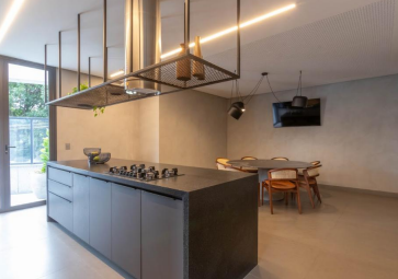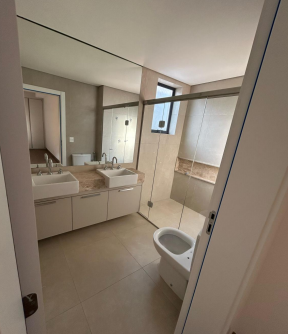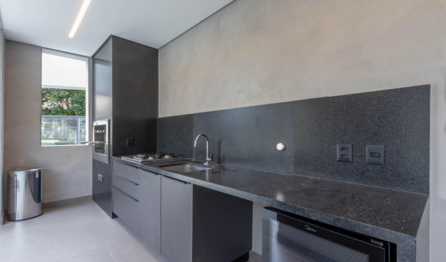 São 150m² distribuídos em 3 suítes, sala ampla para 2 ambientes, varanda com bela vista para a Serra do Curral, lavabo, cozinha planejada com bancadas em granito preto, armários L’IDEA, e área de serviço independente. Os banheiros já estão equipados com armários, espelhos e box em vidro temperado.